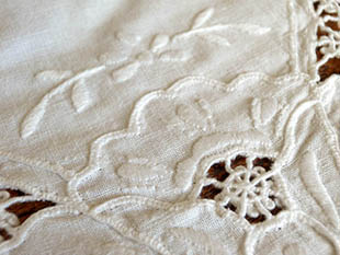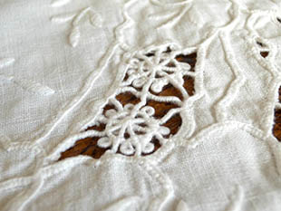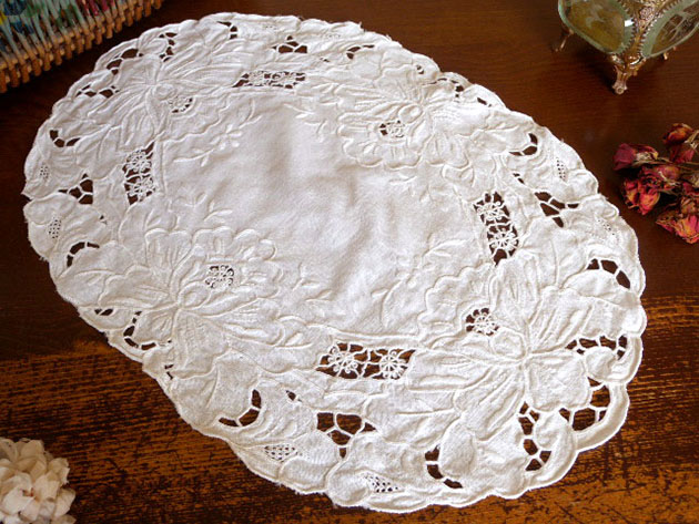 フランスでおそらく1930年代にカットワークの手法で作られたブランシュ(ホワイト)のラン(リネン)の生地のカトレヤブロデルナプロンです。カットワークの手法は織り目がつんでほつれにくい生地にブロデル(刺繍)をしてから内側をハサミで切り抜いてドンテル(レース)模様を作る手法のようです。また、ヨーロッパでは古くからカットワークは僧服やハンカチーフや枕カバーなどに使われていましたが、15世紀頃にヴェネチアで作られた精巧なカットワークは宮廷服に愛用されていたようです。こちらはとてもレアな楕円のフォルムのナプロン(ドイリー)で、本体にはカトレアのお花や葉の模様が白糸刺繍とカットワークの手法で作られていてエレガントでオシャレでとてもいい感じです。また、本体のフチはフリルのようにデザインされているのも素敵ですね。ナプロンとして使うとお部屋がとても華やかな雰囲気になりそうですが、工夫次第で楽しくオシャレに使えそうなブランシュランカトレヤブロデルナプロンです。