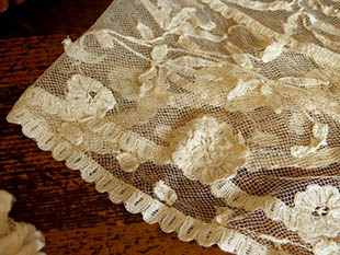 フランスでおそらく1910年代にベージュの木綿のチュールドンテル(チュールレース)で作られたベージュローズ&リス・コルチュールドンテルです。ドンテル(レース)は1500年代の初頭にイタリアの修道院で収入を得るために編まれたのが始まりのようですが、その後、ヴェネチアで広まった後フランスへ伝わっていったようです。フランスではノルマンディー地方のアランソンの町で1650年代頃から制作されたアランソンレースが有名なようです。1平方センチメートル作るのに7時間という気の遠くなるような手間をかけて編まれているようですが、マリー・アントワネットも愛用していたようで現在はユネスコの無形文化財に登録されています。また、チュールドンテルはチュール(ネット状の細かい網目の生地)に柄を編んだり刺繍をしたりして作られたドンテルのことで、フランスのチュール(Tulle)の町が発祥のようです。こちらは大変レアなローブ(ドレス)やシュミズィエ(ブラウス)用に三日月のようなフォルムでのコル(付け襟)で、チュールドンテルの本体にはローズとリス(ユリ)のお花模様のドンテルが縫い付けられていてエレガントでオシャレでとてもいい感じです。また、周りはフリルのようにデザインされているのも素敵ですね。このまま付け襟として使ったり額に入れて壁に飾ったりしても素敵ですが工夫次第で可愛くオシャレに使えそうなベージュローズ&リス・コルチュールドンテルです。
