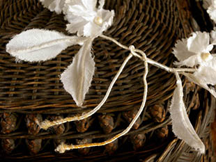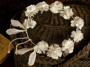 フランスでおそらく1930年代にドゥモアゼル・ドヌール(花嫁介添人)の髪飾り用にブランシュ(ホワイト)のレーヨンのティッシュ(生地)とヴィス(ワイヤー)で制作されたドゥモアゼル・ドヌールウイエクローヌ・ドゥ・フルールです。こちらはとてもレアなおそらくマリアージュ(結婚式)のドゥモアゼル・ドヌールのフィーユ(女の子)達が頭にかぶっていた曲げられたヴィスにブランシュのフィル(糸)を巻いて作られたCouronne de Fleur(クローヌ・ドゥ・フルール/花の王冠)で、本体にはフルールペップ(フラワーペップ)の花芯の付いた光沢のあるブランシュのレーヨンのティッシュで作られたおそらくウイエ(カーネーション)のお花が取り付けられていてエレガントでオシャレでとてもいい感じです。ソワ(シルク)のような光沢のあるレーヨンは1850年代にフランスで発明されたようですが、当時は燃えやすい繊維だったので製造が中止されたこともあるようです。その後、燃えにくいレーヨンが開発されて1920年代にはソワのような輝きがある繊維として普及していったようです。フランスではティッシュやパピエ(ペーパー)で製作されたクローヌ・ドゥ・フルールは大変人気がありますが、花のパリといわれているようにフランス人は昔からお花をモチーフにした小物が大好きなようですね。ドンテルといっしょにパニエ(バスケット)などに入れて飾ったり、工夫次第でお部屋が当時の華やかなパリのような雰囲気に包まれてしまいそうなシャビーシックで素敵なドゥモアゼル・ドヌールウイエクローヌ・ドゥ・フルールです。
