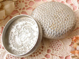 パリのl'Abbe Carton(アッベカートン)通り53にあるLab. Ferre(フェレラボラトリー)が、おそらく1902年頃から製造した錠菓が入っていたアルミニュム製のシュクレエデュルコール・タブレットボワットです。こちらは大変レアなおそらく1940年代に製造されたSucre Edulcor(シュクレエデュルコール)という商品名のサッカリンで作られた甘いタブレットが入っていたボワット(ボックス)で、フタにはアールヌーヴォーのアラベスク模様のレリーフとSucre Edulcor Parisと書かれていてエレガントでオシャレでとてもいい感じです。また、Recommande Aux Diabetiques(糖尿病の方にお奨め)とも書かれています。底面は革のような模様のエンボスでデザインされていてとても凝った作りです。サッカリンはシュクレの300倍以上の甘みがありますが、カロリーがゼロなのでダイエットなどに適しているといわれていたようです。しかし、その後体に有害な甘味料といわれましたが現在では摂取量を守れば特に健康を損ねることはないようです。携帯用の錠剤入れや小さな小物入れなど工夫次第で色々とオシャレに使えそうな一品です。