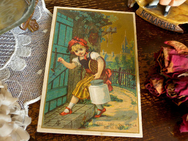 マルセイユから西へ100kmほど行ったモンペリエの町にあるシルク染色とドライクリーニングの専門店のKeller(ケラー)のお店が、おそらく1910年代に広告宣伝用に制作した厚紙製のル・プティシャペロンルージュクロモNo.4です。こちらは超レアなミートエキスの製造で有名なLiebig(リービッヒ)社が1880年代に広告宣伝用に制作したLe Petit Chaperon Rouge(ル・プティシャペロンルージュ/赤ずきんちゃん)のクロモ(トレーディングカード)のイラストをおそらくリービッヒ社と版権元から許可を得て使用して製作されたクロモで、本体の下部には4. Toc... toc... qui est la dit le loup(トントン、誰ですかとオオカミが言いました)のお話と森の家に住んでいる病気のおばあさんにガレットとブール(バター)が入ったポ(ポット)を届けに来て扉をコンコンとたたいている赤ずきんをかぶってロゼ(ピンク)のリュバン(リボン)が付いたジョーヌ(イエロー)とブラン(ブラウン)の縦縞模様のローブ(ドレス)を着たプティシャペロンルージュのイラストがデザインされていてオシャレで可愛くてとてもいい感じです。また、軒先に留まって心配そうに見ている二羽のピジョン(鳩)も可愛いですね。また、イラストはオール(ゴールド)と全て特色インクを使った高価な石版印刷で刷られているのでイラストの発色が良く大変きれいです。また、リービッヒ社のクロモにはプティシャペロンルージュが持っているポにリービッヒのロゴが入ったラベルが貼られているように描かれていましたが、こちらのクロモにはリービッヒのロゴは製版で取り除かれています。裏面にはTeinturerie Parisienne(パリジェンヌのドライクリーニング) Keller(ケラー) 14, boulevart de la Comedie, 14(コメディの大通り14) Montpellier(モンペリエ) Maison speciale pour la Teinture des Soies et le Nettoyage a sec(シルク染色とドライクリーニングの専門店)とCourbe-Rouzet, imp. -e'dit., a Dole(Jura)と書かれているので製作したのは、フランスのジュラ県のドールの町にあるクールブ・ルーゼ印刷会社のようです。こちらはおそらくル・プティシャペロンルージュのクロモの中でも一番人気の高いクロモのようですが、イラストのクオリティーが高いのでコレクターズアイテムとなっているようです。プティシャペロンルージュの表情とロゼのリュバンが付いたブルーのローブがとても可愛い大変貴重なル・プティシャペロンルージュクロモNo.4です。