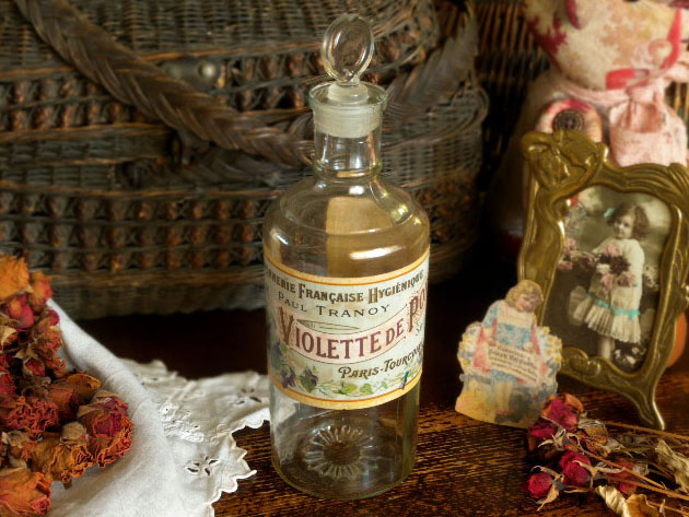 パリとパリから北へ20kmほど行ったノール県のトゥールコワンの町にあるPaul Tranoy(ポール・トラノイ)社が、おそらく1890年代に製造したViolette du Portugal(ヴィオレット・ドゥ・ポルトガル/ポルトガルのスミレの花)という商品名の液体のサヴォン(石鹸)が入っていたガラス製のヴィオレット・ドゥ・ポルトガルサヴォンフラコンです。こちらは超レアなガラスの丸いフタの付いたサヴォンのフラコン(ボトル)で、本体に貼られたブルークレール(ライトブルー)地にジョーヌ(イエロー)の縁取りがあるラベルにはルージュフォンセ(ダークレッド)のViolette du Portugalのロゴとヴィオレットのお花のイラストがデザインされていてオシャレでエレガントでとてもいい感じです。また、王冠と十字架と月桂樹の格調高いエンブレムとアールヌーヴォーのランジュ(オレンジ)色の飾り罫も素敵です。また、ラベルにはSavonnerie Francaise Hygienique(衛生的なフランスの工場) Paul Tranoy, Savon Superfin(植物由来の中性石鹸) Paris-Tourcoing(パリ・トゥールコワン) No.76の表示もあります。また、フラコンのそこ面にはRoger & Gallet(ロジェ&ガレ) Bottle Made in Franceのエンボスがありますが、なぜポール・トラノイ社の製品に1862年代にパリのサントノレ通りでアルマン・ロジェとシャルル・ガレが創設したロジェ&ガレ社のフラコンが使用されているのかは良く分かりません。しかし、ロジェ&ガレ社も同じ時代にサヴォンを製造していたので何らかの業務上の協力関係があったのかもしれませんが、有名なポール・トラノイ社とロジェ&ガレ社のロゴがドゥブル(ダブル)で入っているサヴォンフラコンはやはり超レアですね。ポール・トラノイ社やロジェ&ガレ社の製品は超レアでコレクターズアイテムとしてとても人気がありますが、やはりフランスの製品はデザインクオリティーが高いので納得してしまいますね。当時のフランスのブルジョワの人達が愛用していたエレガントでオシャレな価値ある素晴らしい一品です。