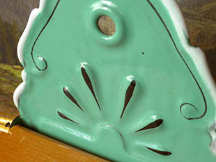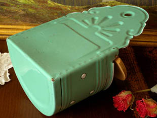 ベルギーでおそらく1920年代に製造されてフランスへ輸出されたほとんど未使用のホウロウ製のブルーヴェール&ブランシュポワセルボワットです。こちらは超レアなヒンジで開閉する無垢材のフタの付いたフランス語のSel(セル/ソルト)を入れるため作られたBoite(ボワット/ボックス)で、ブルーヴェール(ブルーグリーン)の本体にはノワール(ブラック)の縁取りのあるブランシュ(ホワイト)でオランダ語のZout(ザウトゥ/ソルト)のロゴとノワールの縁取りのあるブランシュのポワ(水玉)模様がデザインされていてオシャレで可愛くてとてもいい感じです。また、ブランシュのロゴとポワ模様はホウロウを盛り上げたようなレリーフで立体感がありとても凝った作りです。また、本体の上部にはアールヌーヴォーの曲線的なアラベスク模様のレリーフがデザインされているのも素敵ですね。また、壁掛け用のフック穴がありますが、フランス料理ではセルを頻繁に使うため片手で取りやすいようにセルボワットはほとんど壁に掛けて使われていたようです。セルボワットはセルを入れていたのでサビやすくフタや留め金のないものやサビで底に穴が空いているものなどコンディションの良いものは少ないですが、こちらは驚くほどホウロウの剥がれがほとんどなくサビもないので大切に保存されていたようです。また、マークなどの表示が書かれていたラベルが剥がされているので製造会社についての詳しいことは良く分かりませんが、作りが大変いいのでベルギーの技術の高い工房で製造されたようです。ポワ模様とブルーヴェールの製品はベルギーやフランスでもとても人気が高いですが、セルボワット以外でもキュイズィーヌの小物入れとしてオシャレに使えそうな当時の美しい輝きが今も残っている大変価値ある素晴らしい一品です。
