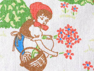 ドイツでおそらく1950年代に製造された木綿製のシュトフ(生地)のレッドライディングフードファブリックです。こちらは大変レアなグリム童話のRotkappchen(ロートカピヒェン/赤ずきんちゃん)の可愛いイラストがデザインされたヴァイス(ホワイト)色のシュトフで、本体には森の家に住んでいる病気のおばあさんに焼き菓子と葡萄酒が入ったコルプ(バスケット)を届けにいく途中の森の道で出会った悪いヴォルフ(オオカミ)に騙されておばあさんのためにきれいな赤いお花を摘んでいるロートカピヒェン、森で悪いヴォルフを探している鉄砲を持った猟師と猟犬、森のおばあさんの家にたどり着いたロートカピヒェンなどのイラストがドリュッケン(プリント)されていてオシャレで可愛くてとてもいい感じです。おそらく当時のドイツのキンダー(子供)達が使っていたお布団のラーケン(シーツ)を小さく裁断したもののようです。ロートカピヒェンのお話はフランス人のシャルル・ペローが1697年に出版した「ペロー童話集」の中にありますが、1812年頃にドイツ人のグリム兄弟が可愛い童話としてリメイクして有名になったようです。ロートカピヒェンの小物といっしょに飾ると可愛いですが、巾着袋などを作ってもオシャレで可愛いですね。見ているだけで楽しくなってきそうな可愛いロートカピヒェン&ヴォルフ・ドリュッケンシュトフです。