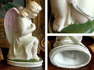 フランスでおそらく1890年代に製造されたポルスレーヌ(磁器)製のガルディアン・アンジュ・ポルスレーヌブドワールデコールです。Boudoir(ブドワール/淑女の私室)は貴族の婦人が書き物をしたりお化粧や着替えをするための部屋で、夫でさえ入室できない婦人専用のお部屋のことのようです。こちらは大変レアなシュヴーブロン(ブロンドヘア)にオール(ゴールド)の縁取りがあるイヴォワールブランシュ(アイボリーホワイト)のローブ(ドレス)を着たGardien Ange(ガルディアン・アンジュ/守護天使)のデコール(装飾品)で、青い瞳とルージュ(レッド)の小さなお口で優しく微笑んで背中の淡いポープル(パープル)の羽を開いてひざまずきながら両手を胸に当てて神様にお祈りをしている姿が神聖で可愛くてとてもいい感じです。また、背面の下部には2993の製造番号のエンボスがあります。ガルディアン・アンジュは神が人間に付けた天使のようで、人間と土地を守ってくれると信じられているようです。また、神のお告げの善を勧めて悪を退けるように人間の心を導く役目を担っているようですが、天では悪魔と戦っているようです。当時のフランスはとても治安がいいとは言えない時代だったので貴婦人達はブドワールにこちらのようなガルディアン・アンジュを飾って身の安全を守ってもらっていたのかもしれませんね。当時のフランスのブドワールの雰囲気で飾るととても素敵ですが、傍にあるだけで色々な危険から守ってくれそうな大変素晴らしいガルディアン・アンジュ・ポルスレーヌブドワールデコールです。