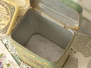 リヨンから北へ80kmほど行ったMassilly(マシイ)の町にあるFer Embal(フェールエンバール)社が、おそらく1920年代に製造したトール(ブリキ)製のブルー&イヴォワールポワ・パッツボワットです。フェールエンバール社はキュイズィーヌ(キッチン)用のシュクレ(シュガー)やファリーヌ(小麦粉)のボワット(ボックス)やアリュメットボワット(マッチボックス)などの缶製品の製造で有名です。こちらはこちらは超レアなフタがヒンジで開閉するPates(パッツ/パスタ)を入れるために作られたボワット(ボックス)で、ブルー地にイヴォワール(アイボリー)のポワ(水玉)模様がデザインされた本体の正面にはアールヌーヴォーのアラベスク模様の飾り罫のあるブルーフォンセ(ダークブルー)の楕円形の中にはイヴォワールの魚眼レンズで見たようなフォルムのPatesのロゴがデザインされていてオシャレで可愛くてとてもいい感じです。また、こちらと同じデザインのアリュメットボワット(マッチボックス)にはFer Embal(フェールエンバール) Massilly Sol(マシリーソル)の表示があります。また、同じデザインでSucre(シュクレ/シュガー)、Cafe(カフェ/コーヒー)、Farine(ファリーヌ/小麦粉)、Chicoree(チコリー/西洋トチノキの新芽)、Poivre(ポワブル/ペッパー)もあるようなのでセットで売られていたようです。また、全て揃うと入れ子で収納できるのでとても使い勝手がいいようです。こちらのようなボワットはダミエ(市松)模様のデサインのものが多いようですが、ポワ模様のものは超レアでフルセットを揃えるのは中々難しいようです。さすがにフランスの製品はデザインクオリティーが高く塗装の剥がれやサビがあってもエレガントな雰囲気はすたれない素晴らしい一品です。