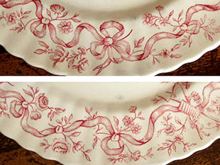 ブルゴーニュ地方のディジョンから南東へ30kmほど行ったAuxonne(オーソンヌ)の町のLongchamp(ロンシャン)で1868年にRobert(ロベルト)とMarcel Charbonnier(マルセル・シャルボニエ)兄弟が創設したロンシャン社が、おそらく1900年代に製造したRubans(リュバン/リボン)という商品名の陶器製のロンシャンローズ&ミオゾティス&リュバン・アシェットです。オーソンヌの町のロンシャンでは、良質な粘土や豊富な木材があったで1835年頃からテュイルリ(タイル)や陶器の製造が盛んになったようです。こちらは超レアな淡いクレーム(クリーム)色の丸いフォルムのAssiette(アシェット/お皿)で、本体の表面の中央にはルージュブラン(レッドブラウン)の色でパニエ(バスケット)に入ったミオゾティス(忘れな草)のお花がデザインされています。また、本体のフチにはローズのお花とミオゾティスのお花がリュバンで結ばれたイラストがデザインされていてオシャレで可愛くてとてもいい感じです。また、フチの波打ったルリエフ(レリーフ)も素敵ですね。また、底面にはミオゾティスのお花とRubansとLongchampと書かれたマルク(マーク)があります。また、Longchamp terre de fer(ロンシャンの鉄の土地)とSLのエンボスがあります。ロンシャンの陶器製品はフランスでも大変人気が高くてコレクターズアイテムとなっているようです。このまま飾るだけで大変素敵ですが、ガトー(ケーキ)やフロマージュ(チーズ)やパンや果物やサラダなどを載せて使ってもオシャレで楽してとても素晴らしいロンシャンローズ&ミオゾティス&リュバン・アシェットです。