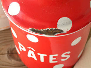 チェコスロバキアにあるDuco(デュコ)社が、おそらく1930年代に製造してフランスに輸出したホウロウ製のルージュ&ブランシュポワ・パッツポです。こちらは超レアな丸く盛り上がったフタの付いたPates(パッツ/パスタ)を入れるために作られたポ(ポット)で、ルージュ(レッド)の本体にはブランシュ(ホワイト)のゴシック書体のPatesのロゴとブランシュのポワ(水玉)模様がデザインされていてオシャレで可愛くてとてもいい感じです。また、デュコ社の製品には、底面にDuco BGB アンクル(錨)のシンボルマークとImporte de Tcheco-Slovaquie(チェコスロバキアからの輸入) のフランス語の表示があるものが多いですがこちらは表示はありません。当時のチェコスロバキアの首都は東欧のパリと呼ばれるほど美しい町並みのプラハ(現在のチェコ共和国の首都)ですが、チェコスロバキアはヨーロッパの中でもドイツに負けないくらい製造技術が高かったようです。また、ホウロウ製品や磁器製品の製造技術も高くフランスのB. B.社の製品にもチェコスロバキアで製造されているものが多くあります。こちらと同じシリーズにはSucre(シュクレ/シュガー)、Farine(ファリーヌ/小麦粉)、Cafe(カフェ/コーヒー)、The(テ/紅茶)、Poivre(ポワブル/ペッパー)などやSel(セル/ソルト)を入れるため作られたBoite(ボワット/ボックス)もあるので沢山コレクションすると楽しいですね。また、デュコ社のポワのホウロウ製品にはブルーとブランシュのものもありますが、ルージュとブランシュのポワのホウロウ製品の方が製造数が少ないようなので大変珍しくてやはり超レアなようです。キュイズィーヌ(キッチン)以外にも飾りながら小物の収納に使ったりすると素敵でチェコスロバキアやフランス文化のゆったりとした時の流れを感じさせてくれそうです。さすがにチェコスロバキアやフランスのホウロウ製品は昔からデザインクオリティーが高くてエレガントな雰囲気がとても素敵ですね。チェコスロバキアからフランスに輸出されたポワ模様が大変オシャレで可愛い一品です。