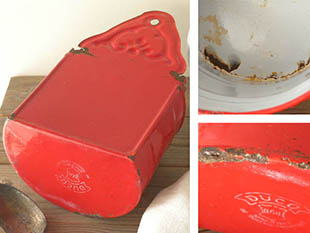 ルージュとブランシュの発色が良くとてもきれいです。Selのロゴに欠けはなくとてもきれいです。木製のフタが欠損しています。写真のように本体のフタを留めていたヒンジ部分がサビで欠損しています。中もホウロウの剥がれやサビが少しあります。その他、多少のホウロウの剥がれやキズやサビや汚れなどがありますが割と状態が良くきれいで、Good Conditionです。