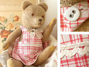 ドイツにあるHaueisen(ハウアイセン)社が、おそらく1940年代の終わり頃に製造したブルムシュティメ(グロウラー)が内蔵したぬいぐるみのカリアテスクライト・ヌスバウムモヘアテディベアです。テディベアは、1902年にアメリカのルーズベルト大統領がベアハンティングで傷を負ったベアを逃がしてやったことが評判になったことで、ニューヨークの玩具店がドイツから輸入したベアのぬいぐるみにルーズベルト大統領の愛称のTeddy(テディ)の名前を付けて売り出したのがテディベアの始まりのようですが、世界で最初にベアのぬいぐるみを製作したのはドイツのシュタイフ社のようです。シュタイフ社はおそらく1900年頃からベアのぬいぐるみの製造を始めているようです。こちらは超激レアな生成りのアラベスク模様のシュピッツェ(レース)のシュライフェ(リボン)を結んでヴァイス(ホワイト)地にロート(レッド)のカリアテス(チェック)模様のクライト(ワンピース)を着たヌスバウム(クルミ)の殻のような色合いの高級なモヘアで作られた鼻スジが長いドイツの伝統的なフォルムの女の子のテディベアで、つぶらなドンケルブラウン(ダークブラウン)と琥珀色のガラス製の目とドンケルブラウンの糸で刺繍されたお鼻の下のお口で優しく微笑んでいるような表情がオシャレで可愛くてとてもいい感じです。また、クライトにはヴァイスのシュピッツェ飾りの付いたタッシェ(ポケット)があり肩には包みクノップ(ボタン)が付けられていますが、ヴァイスの裏地も付けられていてとてもオシャレです。また、頭と胴体と前脚と後脚がジョイントされているのでいろんなポーズが楽しめますが、体の中には木毛が詰められているので押すとザクザクした硬い感触がありジョイント部分には丸い木枠が取り付けられていてとても作りがいいようです。また、前足と後ろ足にはベージュのフェルトのパッドが縫い付けられていますが、ドンケルブラウンの糸の三本の爪も切れずにきれいに残っているのが嬉しいですね。また、胸の部分にはゴルト(ゴールド)のブラスチック製のタグが付けられていて表面にはオラーンジェ(オレンジ)地にゴルトの蹄鉄のマークとHaueisenのロゴがデザインされています。また、ゴルトの裏面にはMade in Germanyのエンボスがあります。また、お腹の中にはブルムシュティメが内蔵されていますが、この時代に製造されたブルムシュティメはほとんど壊れていて鳴きませんが、こちらは体を動かすと「グァー」と鳴くので可愛くて思わず抱きしめてしまいそうです。ドイツではシュタイフ社やテディヘルマン社やマックスヘルマン社のテディベアが有名ですが、ハウアイセン社のテディベアは大変珍しくてやはり超激レアですね。さすがにドイツのテディベアは細部までとても丁寧に作られていて大変作りがいいですが、カリアテス模様のクライトを着たテディベアが傍にいるだけで気持ちが優しく癒されてしまいそうな大変可愛い価値ある一品です。