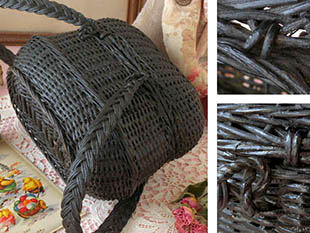 フランスの工房でおそらく1900年代にロタン(ラタン)で製作されたマルシェウフ・アンファンノワールロタンオジエパニエです。こちらは超レアな二つの持ち手の付いたヒンジでオヴァール(楕円形)のフタが開閉するノワール(ブラック)に塗装されたロタン(ラタン)のオジエ(編み込み)で製作されたおそらくアンファン(子供)用のマルシェ(市場)で買ったウフ(卵)を入れるためのパニエで(バスケット)、細いロタンで丁寧に編み込まれたフタと本体の繊維な編み目模様がエレガントでオシャレで可愛くてとてもいい感じです。また、本体の正面にはロタンの留め具があります。また、三つ編みのように編まれた長い二本の持ち手も素敵ですが、持ち手の付け根の部品も全てロタンで作られていてとても凝った作りです。また、フランス人は昔からピクニックが大好きでなので、ママンが作ってくれた美味しそうなサンドイッチやお菓子などを入れるピクニック用のパニエに使っていたかも知れませんね。また、クチュールパニエ(ソーイングバスケット)や小さなぬいぐるみのウルス(ベア)などの収納に使っても便利で可愛いですね。1900年代に製作されたロタンオジエパニエは状態の良いものはほとんど見かけませんが、こちらはフタの留め具の欠損以外は大変状態が良いので大切に保存されていたようです。工夫次第でオシャレに楽しく使えそうな大変素晴らしいマルシェウフ・アンファンノワールロタンオジエパニエです。