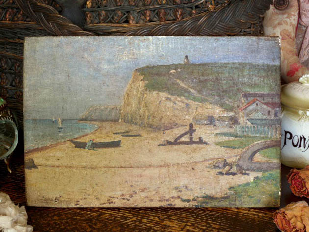 フランスでおそらく1900年代から1910年代に制作されたTableau Huile(タブローユイル/油絵)のコート・デ・エトルタタブローユイルです。こちらは大変レアな5ミリの無垢材の板に描かれたタブローユイルで、本体はおそらくノルマンディー地方のルーアンから北西へ80kmほど行ったEtretat(エトルタ)の村の海岸を描いたフランス語でCote d'Etretat(コート・デ・エトルタ/エトルタの海岸)というような題名のタブローユイルのようです。また、タブローユイルの中央には砂浜の海岸に置かれたおそらく漁師の舟を海から引き上げるための木製の機具と舟を押し上げている漁師が描かれています。また、画面の右端にはブルーグリ(ブルーグレー)に塗られた板の塀に囲まれた白い壁の大きな家が描かれていますが、おそらく夏だけ過ごす別荘のようです。また、遠くには海岸沿いに垂直に切り立った白い石灰岩の断崖が見えますが、崖には頂上へ行く道と頂上の白い灯台が描かれています。また、遠くの海には帆掛船が描かれていますが、おそらく漁師の舟か避暑地にやって来て舟遊びをしている貴族の舟のようです。こちらと同じ風景には印象派の巨匠のクロード・モネが、1880年代に描いた「エトルタの朝」という有名な絵画がありますが、モネは夏になるとエトルタの村に滞在して多くの作品を制作したようですが、こちらを描いた画家はおそらくモネの絵にとても影響を受けたのかもしれません。また、こちらのタブローユイルには画家の名前が書かれていませんが、おそらくエチュード(習作)として描いたもののようです。また、技術的にはとてもしっかりとした作品で、陰の部分は暗い色を多く混ぜて深みを出し日の当たる部分は明るい色を厚塗りで描いています。また、漁師や別荘などの細部まで丁寧に描かれていてとても素敵です。クロード・モネは1926年に亡くなっているのでこちらの作品はモネがまだ生前中に制作されたもののようで、こちらを描いた画家はエトルタの村でモネと出会っていたかもしれませんね。お部屋に飾るだけで当時の北フランスの避暑地の雰囲気が漂ってきそうなエトルタの村の白い石灰岩の断崖が美しい大変素晴らしい一品です。