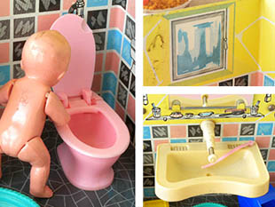 ドイツでおそらく1940年代の終わり頃に製造されたプラスチック製のベービプッペ(ベビードール)と小物付きのブレッヒ(ブリキ)製のプッペンバート&ベービプッペゼッツです。こちらは大変レアなプッペ(ドール)用のPuppen Bad(プッペンバート/ドールバスルーム)のゼッツ(セット)で、ブレッヒ製の本体はシュヴァルツ(ブラック)の大理石のような床と上部がクリーム色で下部はローザ(ピンク)とブラウ(ブルー)とシュヴァルツのフリーゼ(タイル)のようにデザインされた壁があります。また、左の側面の壁には窓がデザインされています。また、右の側面の壁にはMade in Western Germany(ドイツの西部で製造)の表示があります。また、右側にはプラスチック製のローザの便座とフタが開閉するトアレッテ(トイレ)がありますが、壁には蛍光灯とパピーアハルター(ペーパーホルダー)とトアレッテ用の配水管がデザインされています。また、中央にはガラス製の四角いシュピーゲル(ミラー)とプラスチック製のクリーム色のヴァッシュべッケン(洗面台)があります。また、背面の壁にあるプラスチック製のヴァッサータンク(給水タンク)に水を入れると蛇口から水が流れる仕組みになっています。また、シュピーゲルの下には洗面用の小物が沢山デザインされているのもいいですね。また、左側の壁にはプラスチック製のローザの給湯器が取り付けられていますが、下部にはローザのバーデヴァンヌ(バスタブ)があり中にはプラスチック製の腕と足がジョイントされたベービプッペが気持ちよさそうに入浴していてオシャレで可愛くてとてもいい感じです。また、ベービプッペの頭にはGermany、背中には70と三つ葉のエンボスがあります。また、バーデヴァンヌにはシャンプーの容器が置かれていて壁にはバーデトゥーホ(バスタオル)が掛けられています。また、バーデヴァンヌの前にはテッピヒ(ラグ)が敷かれています。また、プラスチック製のゲルプ(イエロー)の体重計やドンケルヴラウ(ダークブルー)のゴミ箱やグリュン(グリーン)のたらいやWeisser Riese(ヴァイザー・リーゼ/白い巨人)と書かれた洗剤の紙箱などもありどれもとても可愛いくて楽しいですね。また、付属品の中には母から娘へ受け継がれると1940年代から1960年代頃までに製造された小物もあります。ドイツは昔からプッペンシュトーベ(ドールハウス)やモヴェヤー(家具や調度品)などの製造で有名ですが、プッペンバートゼッツは見ているだけで可愛いベービプッペの世界に魅せられてしまいそうな大変素晴らしい一品です。(猫は付属しません)