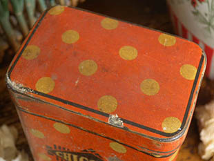 おそらく1920年代にフランスで製造されたトール(ティン)製のルージュ&イヴォワールポワ・チコリーボワットです。こちらは超激レアなChicoree(チコリー)を入れるために作られたボワット(ボックス)で、ルージュ(レッド)地にイヴォワール(アイボリー)のポワ(水玉)模様の本体には、ノワール(ブラック)の四角形の縦縞模様の上にデザインされた菱形の中に魚眼レンズで見たようなフォルムのロゴでChicoreeと書かれた凝ったデザインがオシャレで可愛くてとてもいい感じです。また、こちらのロゴは大変珍しくてやはり超激レアですね。また、同じデザインでSucre(シュクレ/シュガー)、Cafe(カフェ/コーヒー)、Farine(ファリーヌ/小麦粉)、The(テ/紅茶)、Pates(パッツ/パスタ)、Poivre(ポワブル/ペッパー)もあるようなのでアンサンブル(セット)で売られていたようです。また、フタはヒンジで開閉して全て揃うと入れ子で収納できるのでとても使い勝手がいいようです。こちらのようなボワットはダミエ(市松)模様のデサインのものが多いようですが、ポワ模様のものは大変珍しくてフルセットを揃えるのは中々難しいようです。さすがにフランスの製品はデザインクオリティーが高くて塗装の剥がれやサビがあってもエレガントな雰囲気はすたれない大変素晴らしい一品です。