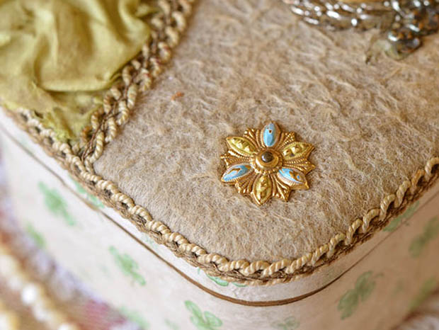フランスでおそらく1890年代に製作されたソワ(シルク)とレーヌ(ウール)と厚紙と真鍮で作られたナポレオン III・トレフル・ブロッシュコフレです。こちらは超レアな豪華で優雅なナポレオン1世の甥のナポレオン3世(1848年 - 1852年)時代の雰囲気で製作されたおそらくブロッシュ(ブローチ)が入っていたコフレ(小箱)で、ヒンジで開閉するフタと本体の側面にはイヴォワール(アイボリー)地にヴェール(グリーン)の幸福を呼ぶ四葉のトレフル(クローバー)がデザインされています。また、フタにはノワイエ(クルミ)の色合いのおそらくレーヌとヴェールムース(モスグリーン)のソワのプリエ(ひだ)飾りが貼り付けられていますが、全て周りはノワイエの紐飾りで縁取りされていてとても凝った作りです。また、レーヌの生地の中央には真鍮に彩色されたロゼ(ピンク)のお花のような飾りと左右に真鍮にブルーで彩色された宝石のような飾りが取り付けられています。また、中央の真鍮と真鍮に銀メッキされたリュバン(リボン)が付いたギルロンド(リース)花飾りの中には丸いマドモアゼルのイラストが入れられていてエレガントでオシャレでとてもいい感じです。また、フタと本体にはオール(ゴールド)の縁取りがされているのも素敵です。また、本体の中の周りにはドンテル(レース)のような化粧紙がリューシュ(フリル)のように付けられているのも可愛いですね。おそらく中には綿が詰められてブロッシュが置かれていたようです。また、底面にはおそらくセルロイドで作られた丸い脚が4個取り付けられています。また、N2254の表示があります。見ているだけでこんなに凝ったデザインのコフレに入っていたブロッシュはどんなに素敵なデザインなのか想像してしまいそうですが、やはりフランスのブロッシュコフレはデザインセンスが良くて素敵です。ビジューコフレ(宝石箱)やクチュールボワット(裁縫箱)に使ったりクロモなどのアンティークの小物を仕舞うのにもとても便利です。また、当時のフランスのブロッシュコフレは使いやすいだけでなく装飾品のように美しくてオシャレなのでお部屋にあるだけで素敵ですね。当時のパリに住むブルジョアのマドモアゼルやマダム達の気分でオシャレに使いたい超レアな素晴らしい価値ある一品です。