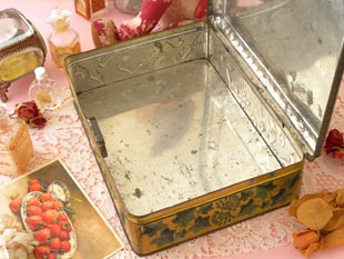 パリから東へ250kmほど行ったドイツとの国境に近いナンシーの町にあるビスロー社がおそらく1920年代に製造したビスキュイ(ビスケット)が入っていたトール(ティン)製のアンファンピクニックビスキュイボワットです。こちらは大変レアなフタがヒンジで開閉するビスキュイボワットで、フタには1907年生まれのパリジェンヌの画家のジェルメーヌ・ヴォレーが描いたアンファン(子供)達のピクニックの絵がデザインされていますが、ギャルソン(男の子)が木下で昼寝をしている間にシオ(子犬)がソーセージをくわえて走っていったのでフィーユ(女の子)が驚いて見ている姿が可愛くてとてもいい感じです。同じナンシーの町にある1896年にエミール・メンヒが創設したアルザ社のビスキュイボワットのフタにもジェルメーヌ・ヴォレーのアンファンの絵がデザインされているのでジェルメーヌ・ヴォレーの絵はフランスではとても人気があったようです。ゴールドの本体の正面の鍵穴の上にはExclusivite Bislor - Nancy(高級なビスロー、ナンシー)と書かれていて本体とフタの周りにはリエール(アイビー)の葉のエンボスがデザインされていてとても凝った作りです。一世紀近くの長い間大切にされてきたビスキュイボワットは、これからもいっそう大切にコレクションしたいオシャレで可愛い一品です。