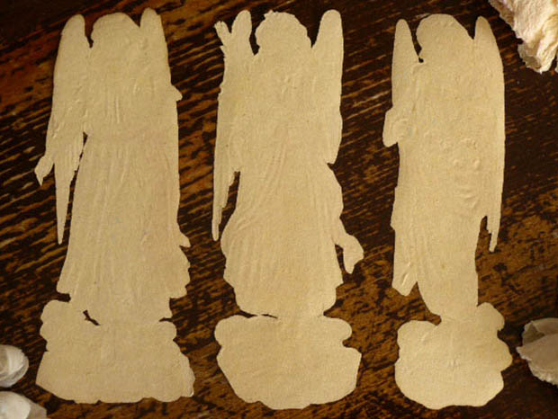 フランスでおそらく1880年代に製作されたほとんどデッドストックの厚紙製の アンジュクロモ3アンサンブルです。こちらは大変レアなAnge(アンジュ/天使)のChromos(クロモ)の3枚のアンサンブル(セット)で、ブルーパール(ペールブルー)とブランシュ(ホワイト)のローブ(ドレス)を着たアンジュは白いピジョン(鳩)と抱いてナルシス(スイセン)のお花を持っています。また、ロゼ(ピンク)のローブを着たアンジュは金の十字架と細長い葉の植物を持っています。また、ブルーとブランシュのローブを着たアンジュは黄色い蝶を手に乗せてローズとマルグリート(マーガレット)のお花を抱えていますが、どれもオシャレで可愛くてとてもいい感じです。また、イラストは全て特色インクを使った高価な石版印刷で刷られているので発色が良くとてもきれいです。また、大変細かく切り抜かれていますが、エンボス加工もしてあるので立体的でとても凝った作りです。清らかで優しそうなアンジュ見ているだけで気持ちが優しく癒されてしまいそうなオシャレで可愛い大変素晴らしい一品です。