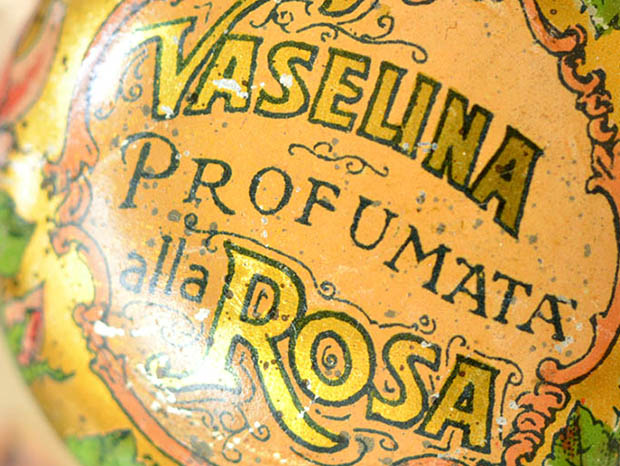イタリアで1900年代に製造されたVaselina(ヴァセリーナ/ワセリン)が入っていたラッタ(ティン)製のプロフマータ・アッラ・ローザヴァセリーナスカートラです。ヴァセリーナは石油から作られたゼリー状のものでハンドクリームやリップクリームとして使える優れものです。こちらは超レアなRosa(ローザ/ローズ)の花の香りのヴァセリーナが入っていたオーロ(ゴールド)に光るスカートラ(ボックス)で、フタのアランチャ(オレンジ)縁取りの中のアヴォーリオ(アイボリー)の中にはVaselina(ヴァセリーナ/ワセリン) Profumata alla Rosa(プロフマータ・アッラ・ローザ/ローズの香り)のオーロとネロ(ブラック)のロゴと文字とローザ(ローズ)のお花のイラストがデザインされていてエレガントでオシャレでとてもいい感じです。また、本体の側面から底面にもローザのお花がデザインされているのもオシャレです。イタリアでは昔から好きな人にローザのお花を贈る習慣があるようですが、アモーレ(愛)の国のイタリア人にはローザのお花は良く似合いますね。また、製造会社についての詳しいことは良く分かりませんが、デザインクオリティーが高いのでイタリアの有名な会社が製造していたようです。当時のイタリアのブルジョワのシニョーラ(レディー)達のボルサ・ア・マーノ(ハンドバッグ)の中には必ず入っていたもののようですが、シニョーラがこちらの美しいスカートラを取り出す仕草はとてもエレガントですね。大変デザインクオリティーが高くて美しいプロフマータ・アッラ・ローザヴァセリーナスカートラです。