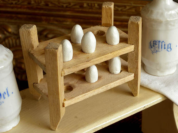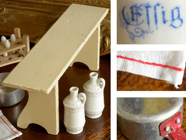 ドイツでおそらく1910年代に木材と陶器と布地で製作されたプッペ(ドール)用のプッペンキュッヒェン・バンク&アイアーシュテンダーゼッツです。ヨーロッパのプッペンシュトゥーベン(ドールハウス)の歴史はとても古く、特にドイツのプッペンシュトゥーベン用のメベール(家具)は製作技術が最も高かったのでとても人気があったようです。こちらは超レアなプッペのキュッヒェ(キッチン)用に無垢材で製作されてエルフェンバイン(アイボリー)に塗装されたBank(バンク/ベンチ)などのゼッツ(セット)で、三人位が座れそうな横長のバンクの左右の二つの脚はアールヌーヴォーの曲線的なフォルムでデザインされていてとても素敵です。また、大変珍しい無垢材で製作された二段のEierstander(アイアーシュテンダー/エッグスタンド)には陶器製の六個の白いEi(アイ/卵)が付属しています。また、陶器製の持ち手の付いた二つの白いKannchen(ケンヒェン/ポット)も付属していますが、本体にはドイツの中世以来の伝統的な格調高いFraktur(フラクトゥール)の書体でOel(エール/オイル)と Essig(エッスィヒ/お酢)と書かれていますが、本体の上部と下部には浮き彫り細工がデザインされていてとてもオシャレです。また、本体がアルミ製でロート(レッド)で塗装された持ち手がブリキ製のBratpfanne(ブラートプファンネ/フライパン)とロートの線が刺繍された木綿のエルフェンバインヴァイス(アイボリーホワイト)のHandtuch(ハントトゥーフ/タオル)が付属しているまも嬉しいですが、お気に入りのプッペといっしょに飾るとオシャレで可愛くてとてもいい感じです。おそらく当時のブルジョワのキンダー(子供)達のために製作されたもののようですが、職人が一つ一つ手作りで作っているようなので大変作りがいいですね。どこを見ても手抜きのない素晴らしい作りに見とれてしまいキンダーだった頃の楽しい思い出が蘇ってきそうですが、ドイツのプッペンシュトゥーベン用のメベールはやはり作りがいいですね。母から娘へと代々受け継がれてきた素晴らしいプッペンキュッヒェン・バンク&アイアーシュテンダーゼッツはこれからも大切にしていきたい大変素晴らしい一品です。