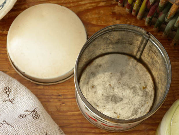 フランスでおそらく1930年代に製造されたトール(ティン)製のルージュスリーズ・イヴォワールトールポワブルボワットです。こちらは超レアなフタの付いたイヴォワール(アイボリー)の筒型のキュイズィーヌ(キッチン)用のPoivre(ポワブル/ペッパー)を入れるために作られたボワット(ボックス)で、本体の正面にはポショワール(ステンシル)の技法で描かれたようなノワール(ブラック)のPoivreのロゴがデザインされています。また、ロゴの上には枝に生ったルージュ(レッド)のCerise(スリーズ/サクランボ)のイラストがデザインされていてオシャレで可愛くてとてもいい感じです。こちらと同じシリーズにはSucre(シュクレ/シュガー)、Farine(ファリーヌ/小麦粉)、Cafe(カフェ/コーヒー)、Pates(パッツ/パスタ)、Chicoree(チコリー)やAllumettes Boite(アリュメットボワット/マッチボックス)、Sel Boite(セルボワット/ソルトボックス)などもあるようなので全部揃えると古い時代のフランスの家庭のキュイズィーヌの雰囲気が漂うようで素敵で楽しいですね。さすがにフランス製品はデザインクオリティーが高くて塗装の剥がれやサビがあってもエレガントでオシャレな雰囲気はすたれないですね。キュイズィーヌの小物入れに便利ですが工夫次第で色々とオシャレに使えそうな超レアなルージュスリーズ・イヴォワールトールポワブルボワットです。