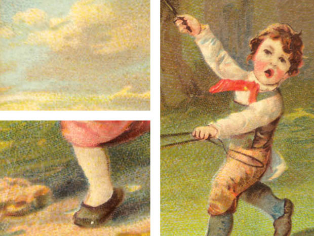 ドイツで1900年代に製造された厚紙製のキンダー・シュピーレン・プフェーアトコーチ・ポストカルテです。こちらは大変レアなキンダー(子供)達の楽しいイラストがデザインされたPostkarte(ポストカルテ/ポストカード)で、本体の表面には野原でプフェーアトコーチ(馬車)のように遊んでいるキンダー達の姿がデザインされていてオシャレで可愛くてとてもいい感じです。また、馬になってプッペ(ドール)を抱いて走っている女の子達や男の子の後ろでは鞭を持って手綱を引いている男の子の姿など、当時のドイツの子供達の服装などもとても丁寧に描かれていて素敵です。また、遠くの木々や夕焼け空の風景などが油絵のようにしっかりと描かれていてとてもクオリティーの高いイラストのようです。また、イラストは高価な全て特色を使った石版印刷で刷られているので何年経っても発色がよくて素晴らしいですね。また、イラストには大変深いエンボス加工がしてあるので立体的に見えてとても凝った作りです。また、裏面にはドイツ語のPostkarteの他にも沢山のヨーロッパの言葉でポストカルテと書かれています。また、19 Febr 16-17 08の消印があるので1908年2月19日に投函されたポストカルテのようです。110年も前にドイツで製造された大変可愛いキンダー・シュピーレン・プフェーアトコーチ・ポストカルテです。