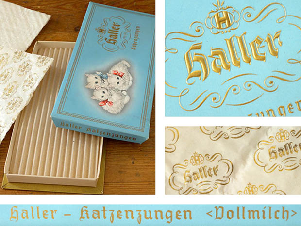 ドイツ南部のシュトゥットガルトの町で1921年にKarl Haller(カール・ハラー)が創設したHaller(ハラー)社が、おそらく1950年代に製造したショコラーデ(チョコレート)が入っていた厚紙製のカッツェンツンゲン・ヘルブラウショコラーデカステンです。ハラー社は、1926年にシュトゥットガルトの郊外のオーバーテュルクハイムの町に会社を移転したようですが、第二次世界大戦が勃発するとショコラーデ(チョコレート)を製造するための原料のカカオと砂糖の入手が難しくなり工場はハーブティーなどの製造に切り替えたようです。また、戦争が終わると1949年からはショコラーデの製造をまた始めたようです。こちらは超レアなKatzenzungen(カッツェンツンゲン/猫の舌)という商品名の猫の舌のようなフォルムのショコラーデが入っていた四角いフォルムのフタの付いたヘルブラウ(水色)のカステン(ボックス)で、フタの天面にはハラー社のイニシャルのHをデザインした格調高い飾り罫とHallerのロゴとKatzenzungenの文字がゴルト(ゴールド)でデザインされていてとても素敵です。また、ローザ(ピンク)とヘルブラウのシュライフェ(リボン)を首に結んだ三匹の白いカッツェン(子猫)達がデザインされていてオシャレで可愛くてとてもいい感じです。また、イラストは細部のでとても丁寧に描かれていますが、イラストと飾り罫とロゴと文字には立体的なエンボス加工がしてありとても凝った作りです。また、フタの側面にはゴルトでHaller KatzenzungenとVollmilch(フォルミルヒ/全乳)の文字がデザインされています。また、エルフェンバイン(アイボリー)にゴルトの縁取りがある本体の底面にはゴルトでオーバーテュルクハイムの町にあるショコラーデ工場のイラストとQualitat seizt sich durch, das werden auch Sie beim Genuss dieser Schoklade feststellen(このチョコレートを食べればわかるように品質が優先されています) Karl Haller(カール・ハラー) Kakao(カカオ) U. Schokoladefabrik(チョコレート工場) Stuttgart(シュトゥットガルト) Oberturkheim(オーバーテュルクハイム) Inhalt(内容量) 10 Katzenzungen(猫の舌が10個)などの書かれているようです。また、カステンの中には中敷きも全て残っているのが嬉しいですね。可愛いカッツェン達のイラストを見ているだけで気持ちが優しく癒されてしまいそうなハラー社の超レアな素晴らしい一品です。(猫のクロモは付属しません)