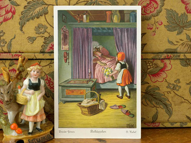 ドイツのミュンヘンで1916年に創設されたUvachrom(ウーヴァクロム)社が、おそらく1920年代に製造した未使用の厚紙製のロートカピヒェン&ヴォルフ・ウーヴァクロムポストカルテNo.5です。こちらは超レアなグリム童話のRotkappchen(ロートカピヒェン/赤ずきんちゃん)の楽しいイラストとお話がデザインされたNo.5のポストカルテ(ポストカード)で、表面には悪いヴォルフ(オオカミ)が病気まおばあさんに変装しているとは知らないでコルプ(バスケット)に入ったクーヘン(焼き菓子)と葡萄酒とおばあさんのために摘んできたきれいなお花を森の家に住んでいる病気のおばあさんに届けに着ましたが、何だかおばあさんの様子がおかしいので色々と質問をしているロートカピヒェンのイラストがデザインされていてオシャレで可愛くてとてもいい感じです。また、イラストは1868年生まれのドイツ人の画家のOtto Kubel(オットー・クーベル)の作品でおばあさんの家の調度品の細部まで緻密に描かれたクオリティーの高いイラストがとても素敵ですね。また、イラストの下部にはO. Kubelのサインと本体の下部にはBruder Grimm(グリム兄弟) Rotkappchen, O. Kubelの表示があります。また、裏面の左上には「ロートカピヒェンがおばあさんの家に着いたときに、どうしましょうおばあさんの耳がこんなに大きくなって・・・」のロートカピヒェンのNo.5のお話が書かれているのも楽しいですね。また、Uvachrom(ウーヴァクロム)社のロゴマークとNr.3734. Serie 128.の表示があります。ロートカピヒェンのお話はフランス人のシャルル・ペローが1697年に出版した「ペロー童話集」の中にありますが、1812年頃にドイツ人のグリム兄弟がキンダー(子供)達のために可愛くリメイクして有名になったようです。百年近く前に製造されたロートカピヒェンのお話とイラストがデザインされたポストカルテですが、とても可愛いので使用しないで大切に保存されていたようです。ロートカピヒェンのイラストがオシャレで可愛い一品です。