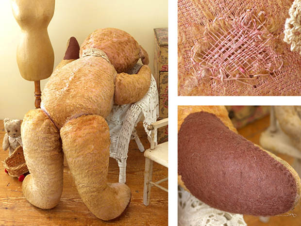 子供達に大変人気があったようなのでロゼのモヘアに抜けが多くあります。ジョイントの内側以外はロゼのモヘアがほとんど色焼けしています。ガラスの目にキズはほとんどなく大変きれいです。お鼻とお口の刺繍に少し傷みがありますが切れはなくとてもきれいです。ジョイントに壊れはなく頭と前脚と後脚はスムーズに動きます。パッドは全てブランフォンセのフートゥルに取り替えられていてほつれや破れはなくとてもきれいです。写真のように古い時代に胸の破れがおそらくママンの手でロゼの糸で修理されています。リュバンに破れはなくとてもきれいです。ブルイーターは現状では鳴きません。その他、少し傷みや汚れなどありますがほつれや破れはなくとても状態が良くきれいで、Good Conditionです。