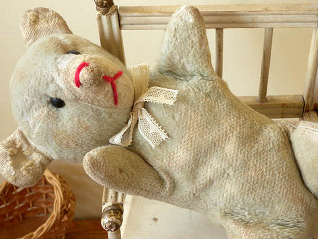 フランスでおそらく1940年代に製造したぬいぐるみのブルーパール&イヴォワールレーヌ・べべウルスです。Teddy Ours(テディウルス/テディベア)は、1902年にアメリカのルーズベルト大統領が熊狩りで傷を負ったウルス(ベア)を逃がしてやったことが評判になったことで、ニューヨークの玩具店がドイツから輸入したウルスのぬいぐるみにルーズベルト大統領の愛称のTeddy(テディ)の名前を付けて売り出したのがテディウルスの始まりのようですが、世界で最初にウルスのぬいぐるみを製作したのはドイツのシュタイフ社のようです。また、フランスではテディウルスはドイツから輸入していたようですが、1914年に第一次世界大戦が勃発すると輸入ができなくなりフランスでは1919年頃からPintel(パンテール)社が初めてテディウルスの製造を始めたようです。こちらは超レアなブルーパール(ペールブルー)のレーヌ(ウール)で作られた生まれたばかりのようなBebe(ベベ/ベビー)のOurs(ウルス/ベア)で、イヴォワールブランシュ(アイボリーホワイト)のアラベスク模様のドンテル(レース)のリュバン(リボン)を首に結んだつぶらなブルーフォンセ(ダークブルー)のおそらくセルロイドの目とルージュ(レッド)の糸で刺繍されたお鼻の下のお口で優しく微笑んでいるような姿がオシャレで可愛くてとてもいい感じです。また、耳の内側と鼻スジはイヴォワール(アイボリー)のレーヌで作られているのも素敵ですが、万歳をしたような前脚と大きく広げた後脚とお尻の小さなシッポも可愛いですね。また、体の中は全て硬いザクザクとした木毛が詰められているようです。また、全てジョイントではありませんが、前脚と後脚の付け根部分は木毛が少なくして作られているので左右に動かすことができます。また、製造した会社についての詳しいことは良く分かりませんが、フランスのぬいぐるみのウルスはちょっと変わった作りがオシャレで可愛いです。フランスから遥々やって来たオシャレで可愛いベベウルスが傍にいるだけで気持ちが優しく癒されてしまいそうな超レアな大変素敵な一品です。