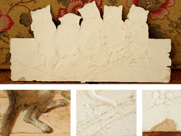 フランスで1899年代に制作された厚紙製のシャトンクロモ・カランドリエです。こちらは超レアな1900年用のCalendrier(カランドリエ/カレンダー)のChromos(クロモ)で、本体の表面にはオール(ゴールド)でMars(3月)とApril(4月)のカランドリエがデザインされています。また、ブルーのミオゾティス(忘れな草)のお花が咲いた板の垣根に登って楽しそうに遠くを見ている五匹のシャトン(子猫)達の後ろ姿がデザインされていてオシャレで可愛くてとてもいい感じです。また、シャトン達の尻尾と後ろ足をバタバタとさせて垣根を登ろうとしている姿も可愛いですね。また、シャトンのクロモは全て特色インクを使った高価な石版印刷で刷られているので発色が良く大変きれいです。また、クロモには立体的なエンボス加工がしてとても作りがいいですね。また、カランドリエがには全ての日にPurification(聖母マリアの清めの祝日)などのその日が何の日かが書かれていて大変凝った作りです。シャトンの可愛いカランドリエクロモを見ているだけで気持ちが優しく癒されてしまいそうですが、125年もの長い間大切に保存されていた大変素晴らしい一品です。