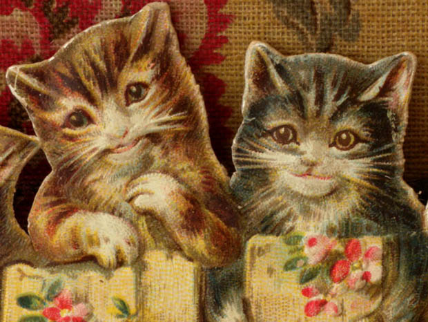 フランスで1899年代に制作された厚紙製のシャトンクロモ・カランドリエです。こちらは超レアな1900年用のCalendrier(カランドリエ/カレンダー)のChromos(クロモ)で、本体の表面にはオール(ゴールド)でMai(5月)とJuin(6月)とJuillet(7月)とAugust(8月)のカランドリエがデザインされています。また、ロゼ(ピンク)とブルーのミオゾティス(忘れな草)のお花が咲いた板の垣根に登ってこちらを見て楽しそうに微笑んでいる五匹のシャトン(子猫)達がデザインされていてオシャレで可愛くてとてもいい感じです。また、シャトンのクロモは全て特色インクを使った高価な石版印刷で刷られているので発色が良く大変きれいです。また、クロモには立体的なエンボス加工がしてとても作りがいいですね。また、カランドリエがには全ての日にPurification(聖母マリアの清めの祝日)などのその日が何の日かが書かれていて大変凝った作りです。シャトンの可愛いカランドリエクロモを見ているだけで気持ちが優しく癒されてしまいそうですが、125年もの長い間大切に保存されていた大変素晴らしい一品です。