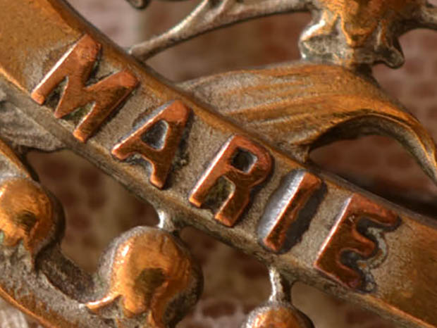 フランスでおそらく1890年代にキュイヴル(銅)で製作されたミュゲ&ピジョンベベシャルム・キュイヴルブロッシェです。こちらは超レアなBebe(ベベ/ベビー)用のCharme(シャルム/幸運または魔除けの小さな飾り物)のBroche(ブロッシェ/ブローチ)で、赤褐色のキュイヴルの本体の中央にはリュバン(リボン)の中にMarie(マリー )の女の子の名前がエンボスでデザインされていてオシャレで可愛くてとてもいい感じです。また、リュバンの後ろには可憐なミュゲ(スズラン)のお花と幸せの象徴の二羽のピジョン(鳩)がルリエフ(レリーフ)でデザインされているのも素敵ですが。大変凝った作りです。また、16世紀のシャルル9世の頃からフランスではミュゲの花を贈る習慣があるようですが、フランスではミュゲは幸福を呼ぶ花と言われているようです。また、背面には鉄製のエパングル(ピン)とエパングル留めがあります。おそらく当時のフランスでベベが生まれるとその子の名前がデザインされたこちらのブロッシェをバヴォワー(よだれかけ)や衣服などに付けてお祝いの品として贈ったようです。こちらのブロッシェがあるだけで幸せが沢山やって来そうな超レアな大変可愛い一品です。