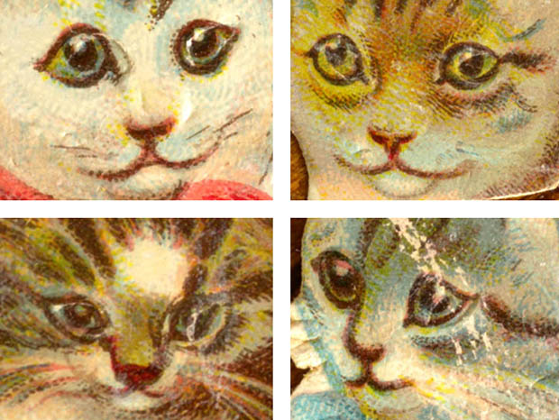 イラストの発色が良く大変きれいです。右上のシャトンのひたいに多少の印刷の傷みがありますが折れスジではありません。左下のシャトンのひたいが多少の色抜けのようになっていますが、印刷面はコーティングされているので原画のままのようです。裏面に多少の傷みがあるものもあります。その他、多少の傷みや汚れなどありますが折れや破れはなくとても状態が良くきれいで、Good Conditionです。