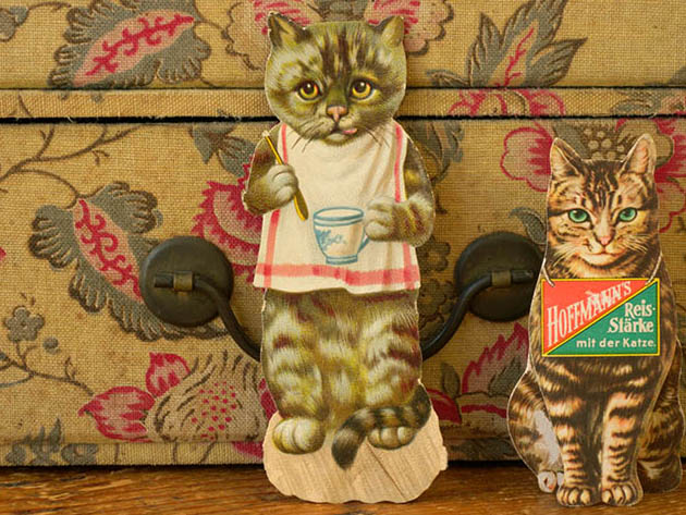 フランスでおそらく1890年代に製作された厚紙製のタス&キュイエール・シャトンクロモです。こちらは超レアなChaton(シャトン/子猫)のChromo(クロモ/スクラップ)で、本体はブランシュ(ホワイト)にロゼ(ピンク)のリーニュ(ライン)があるセルヴィエット(ナプキン)を首に巻いておそらく飲んでしまった温かいレ(ミルク)が入っていたブランシュにブルークレール(水色)の縁取りとお花模様があるタス(カップ)とオール(ゴールド)のキュイエール(スプーン)を持って口の周りに付いたレを美味しそうに舌で舐めている姿がデザインされていてオシャレで可愛くてとてもいい感じです。また、本体はフォルムに沿って細かく切り抜かれていますが、イラストは高価な全て特色を使った石版印刷で刷られているので何年経っても発色が良くて素晴らしいですね。また、立体的なエンボス加工もされていて大変凝った作りです。世界で一番高価な野球選手のホーナス・ワグナーのクロモはアメリカのオークションで2億円以上で落札されているようですが、こちらもこれから価値は上がっても下がることはないようで高値がつくと嬉しいですね。フランスで1890年代に作られた超レアな大変可愛い一品です。(右横のホフマン社の猫のクロモは付属しません)