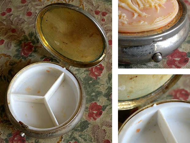 カメオのロココ調のルリエフが大変きれいです。留め金とヒンジに壊れはなくフタはスムーズに開け閉めできます。セルロイドの丸いボワットに欠けやヒビはなくとてもきれいです。その他、多少の傷みや汚れなどありますが欠けや壊れはなくとても状態が良くきれいで、Good Conditionです。