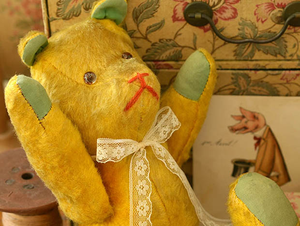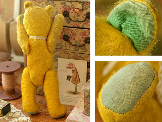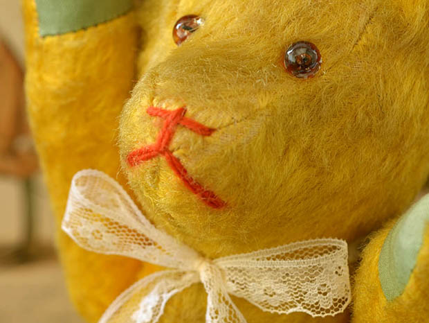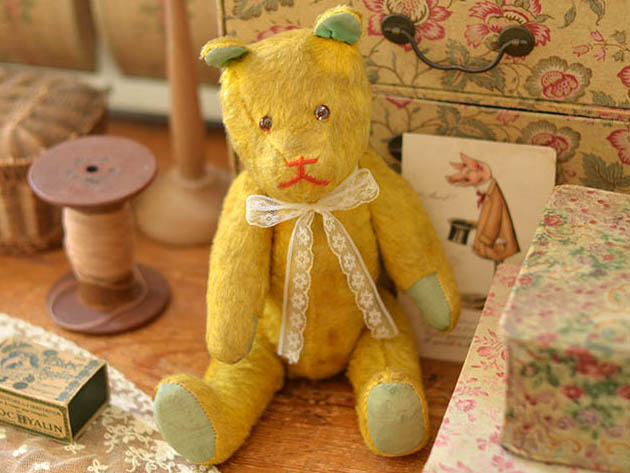 フランスでおそらく1940年代に製造されたぬいぐるみのオールモヘア&ヴェールグリティッシュ・べべテディウルスです。Teddy Ours(テディウルス/テディベア)は、1902年にアメリカのルーズベルト大統領が熊狩りで傷を負ったウルス(ベア)を逃がしてやったことが評判になったことで、ニューヨークの玩具店がドイツから輸入したウルスのぬいぐるみにルーズベルト大統領の愛称のTeddy(テディ)の名前を付けて売り出したのがテディウルスの始まりのようですが、世界で最初にウルスのぬいぐるみを製作したのはドイツのシュタイフ社のようです。こちらは超レアなイヴォワールブランシュ(アイボリーホワイト)のお花模様のドンテル(レース)のリュバン(リボン)を首に結んだ高級なオール(ゴールド)のモヘアで作られたまだべべ(ベビー)のテディウルスで、つぶらな琥珀色がかった透明なガラスの目とルージュ(レッド)の糸で刺繍されたお鼻の下のお口で優しく微笑んでいるような表情がオシャレで可愛くてとてもいい感じです。また、耳の内側と前足と後ろ足のパッドはヴェールグリ(グリーングレー)のティッシュ(生地)で作られているのもオシャレで素敵ですが、頭の上にピンと立った小さな耳がフランスらしくてとても可愛いですね。また、前脚と後脚が太い針金でジョイントされているのでいろんなポーズが付けれますが、体の中は全て硬いザクザクとした木毛が詰められているようです。また、布地のタグはありませんが、布タグは1950年代の中頃から付けられるようになりこの時代のぬいぐるみには厚紙製のタグが首に付けられていたようです。また、こちらはパリ郊外のエソンヌ県のマッシーの町にある大変人気のあるJ. P. M.(Jouet Paris Massy/ジ・ペ・エム)社のテディウルスのように耳の外側と内側がオールとヴェールグリの対照的な色合いになっていて大変良く似ていますが、おそらくJPM社のテディウルスではないようです。また、ジ・ペ・エム社のテディウルスは、フランスでも大変人気があり今では高価な上に入手が大変難しくなってきているようです。フランスから遥々やって来たオールとヴェールグリのオシャレで可愛いテディウルスが傍にいるだけで気持ちが優しく癒されてしまいそうな超レアな大変素敵な一品です。