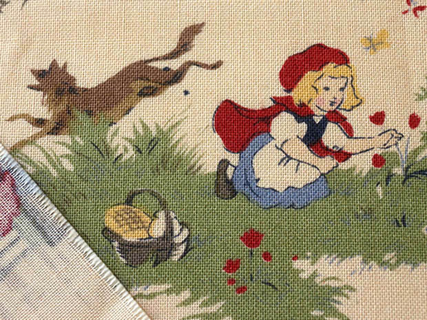 ニューヨークのフランクリン通りで1911年にMarcus(マーカス)兄弟が創設したMarcus Brothers Textiles(マーカスブラザーズテキスタイル)社が、おそらく1980年代に製造したデッドストックのコットン製のファブリック(生地)のレッドライディングフード&ウルフ・ファブリックです。こちらは大変レアなグリム童話のRed Riding Hood(レッドライディングフード/赤ずきんちゃん)の可愛いイラストがデザインされたベージュ色のファブリックで、本体にはママから焼き菓子とポットに入ったバターを森の家に住んでいる病気のおばあさんに届けるお使いを頼まれているレッドライディングフード、おばあさんの家に行く森の道で親切そうな悪いウルフ(オオカミ)に出会ったレッドライディングフード、悪いウルフにだまされておばあさんのためにきれいなお花を摘んでいるレッドライディングフード、急いで先回りしておばあさんの家のドアをノックしている悪いウルフ、ベッドの中のおばあさんの姿の変わりように驚いているレッドライディングフードなどのイラストがプリントされていてオシャレで可愛くてとてもいい感じです。レッドライディングフードのお話はフランス人のシャルル・ペローが1697年に出版した「ペロー童話集」の中にありますが、1812年頃にドイツ人のグリム兄弟が可愛い童話としてリメイクして有名になったようです。レッドライディングフードの小物といっしょに飾ると可愛いですが、小さなクッションカバーなどを作ってもオシャレで可愛いですね。見ているだけで楽しくなってきそうな可愛いレッドライディングフード&ウルフ・ファブリックです。