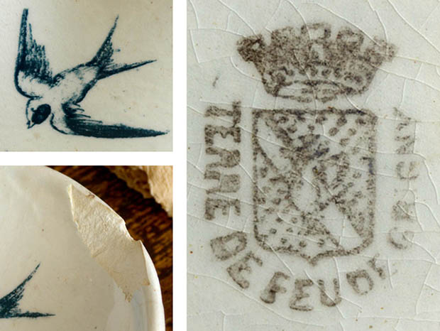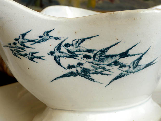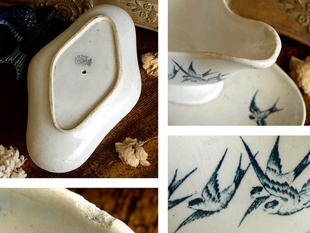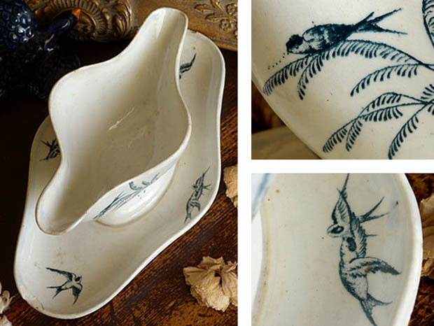 フランスでおそらく1890年から1910年代に製造されたGrigny(グリニー)のファイアンス(陶磁器)のブルーフォンセイロンデール・ファイアンスソーシエールです。リヨンから南へ20kmほど行ったローヌ川沿いのGrigny(グリニー)の町で、おそらく1830年代頃にDecaen(デカン)兄弟が陶器工場を創設したのがグリニーのファイアンスの始まりのようです。また、こちらのファイアンスはカオリンを混ぜて白くして耐久性を高めているようです。こちらは超レアなお料理のソースを入れるためのソーシエール(Sauciere/ソース入れ)で、楕円形のアシェット(お皿)の上に舟のようなフォルムの底の深いアシェットを載せられたように作られています。また、本体には大空を楽しそうに飛んでいるような22羽のブルーフォンセ(ダークブルー)のイロンデール(ツバメ)と枝に止まった2羽のイロンデールがデザインされていてデザインクオリティーが高くてエレガントでオシャレで可愛くてとてもいい感じです。また、底面にはグリニーのマークがあり王冠マークとその下の紋章には斜めにタスキを掛けた中に陶磁器の水差しがデザインされているようです。また、Terre de Feu de Grigny(テール・ドゥ・フー・グリニー)の表示もありとても素敵です。また、マークのデザインも年代によって異なり沢山あるのでこちらも色々と調べてみるのも楽しいですね。また、イロンデールは幸せを運ぶ鳥と言われていますが、沢山の幸福を運んできてくれると嬉しいですね。まだまだソーシエールとして十分に使えそうですが、フルールセッシェ(ドライフラワー)などを入れて飾ったりするのもオシャレで大変素晴らしいブルーフォンセイロンデール・ファイアンスソーシエールです。