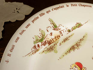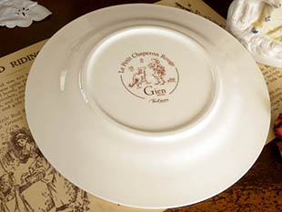 パリから南へ120kmほど行ったロワール川沿いのジアンの町で1821年に創設されたGien(ジアン)社が、おそらく1980年代の終わり頃に製造したデッドストックの陶器製のル・プティ・シャペロンルージュアシェットNo.1です。ジアン社はファイアンス焼きの陶器工房としてヨーロッパでとても有名です。こちらはレアなLe Petit Chaperon Rouge(ル・プティ・シャペロンルージュ/赤ずきんちゃん)の楽しいイラストがデザインされたアンファン(チャイルド)用のNo.1の白いアシェット(お皿)で、本体の上部にはIl etait une fois, une petite fill qui s'appelait le Petit Chaperon Rouge(昔々、小さな赤ずきんちゃんという名前の小さな女の子がいました)の文字とお母さんから森の家に住んでいる病気のおばあさんに壺に入ったブール(バター)とガトー(ケーキ)を届けにいくお使いを頼まれているプティ・シャペロンルージュのイラストが手塗りされていてオシャレで可愛くてとてもいい感じです。また、周りの景色も丁寧に描かれていてとても素敵ですね。裏面の中央にはLe Petit Chaperon Rouge, Gien France, Peint main(手塗り)のロゴと文字と森の道で親切そうな悪いオオカミに出会ったプティ・シャペロンルージュのイラストがデザインされているのも可愛いですね。ル・プティ・シャペロンルージュはフランス人のシャルル・ペローが1697年に出版した「ペロー童話集」の中にありますが、1812年頃にドイツ人のグリム兄弟がアンファン達のために可愛くリメイクして有名になったようです。可愛いシャペロンルージュのアシェットを見ているだけで当時のアンファン達がアシェットに載ったガトーを食べながらママンから「赤ずきんちゃん」のお話を聞いている可愛い姿が想像できそうなル・プティ・シャペロンルージュアシェットNo.1です。