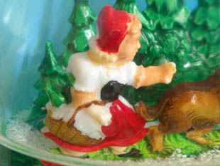ドイツの西部地方にあるGesch(ゲッシュ)社がおそらく1940年代の終わり頃に製造したほとんどデッドストックのプラスチック製のロートカピヒェン・シュネークーゲルです。ゲッシュ社は「赤ずきんちゃん」や「ヘンゼルとグレーテル」などのビルトベトラヒター(ストーリービューアー)の製造で有名です。こちらは超レアなヴラウ(ブルー)とグリュン(グリーン)と透明なプラスチックで作られたロートカピヒェン(赤ずきんちゃん)の楽しいお話のクーゲル(ドーム)のフォルムのSchneekugel(シュネークーゲル/スノードーム)で、本体の中には森の家に住んでいる病気のおばあさんにクーヘン(ケーキ)とブドウ酒を届ける途中の道で親切そうな悪いヴォルフ(オオカミ)に出会ったロートカピヒェンがフィギュアで作られていてオシャレで可愛くてとてもいい感じです。また、背景の森の木々も立体で作られていてとても凝った作りです。また、本体の中には水と白い小さな粒が入れられているので逆さまにしてから元に戻すと白い粒のシュネー(雪)がクーゲルの中で舞います。中の水が三分の一位になっているのでシュネーは足元だけで舞いますが、製造されてから70年位も経っているシュネークーゲルなので中の水が自然蒸発していても仕方ないですね。本体の底面にはMade in Western Germany, 4/1072, Ges. Gesch 1675631のエンボス表示がありますが、Western Germanyは1949年にドイツが東西に分断する前のドイツの西部地方のことのようですが、東西に分断してからのWest Germany(西ドイツ)とは異なるようです。ゲッシュ社は1980年代頃までこちらの製品を製造していたようですが、それ以降はWalter & Predger(ヴァルター&プレジャー)社が金型を受け継いで製造しているようです。しかし、ゲッシュ社の製品は数が少なくやはり超レアですね。見ているだけで当時のドイツのキンダー(チャイルド)達がシュネークーゲルをのぞきながらママーから「赤ずきんちゃん」のお話を聞いている可愛い姿が想像で着そうな楽しい一品です。