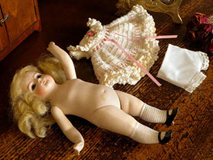 ドイツでおそらく1930年代から1940年代にビスキュイ(ビスク/磁器)で製作されたロココローズトリコローブ・ジュンヌフィーユビスキュイプーペです。ビスキュイプーペは19世紀のヨーロッパのブルジョアのマドモアゼルやマダム達の間で流行ったプーペ(人形)で、フランス語のBiscuit(ビスキュイ)はお菓子のビスケットと同じように「二度焼き」が語源のようです。また、Mignonette(ミニョネット)はMignon(ミニョン/可愛い・小さい)の単語にetteの接尾辞が付いたもので、「さらに小さくて可愛い」という意味のようです。こちらは大変レアなおそらくオリジナルのカールした長いシュヴーブロン(ブロンドヘア)に胸元に18世紀の優雅なロココ調のようなルージュ(レッド)のローズのお花のモチーフとロゼ(ピンク)のリュバン(リボン)飾りの付いたイヴォワール(アイボリー)のトリコ(ニット)編みのローブ(ドレス)を着たジュンヌフィーユ(少女)のビスキュイプーペで、ガラス製の美しいつぶらなブラン(ブラウン)の瞳とルージュの口元で優しく微笑んだ表情が可愛くてとてもいい感じです。また、袖口と裾のフリルも可愛いですね。また、ローブの下にはブランシユ(ホワイト)のドンテル(レース)飾りの付いたキュロット(ショーツ)を履いています。また、足には彩色されたブランシュのショセット(ソックス)にノワール(ブラック)のショスュール(靴)を履いているのも素敵ですね。頭も体もビスキュイ製で腕と脚がジョイントされていてるので色々なポーズが楽しめるのがいいですね。後頭部には製造メーカーのエンボスはありませんが、細部まで丁寧に作られていてとても凝った作りなのでしっかりとした工房で製作されたようです。ビスキュイプーペの製作もそろそろ終わりを迎えようとしていた時代に作られた美しくて可愛いロココローズトリコローブ・ジュンヌフィーユビスキュイプーペです。