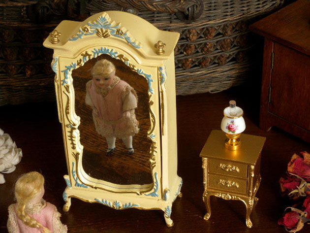 フランスでおそらく1960年代から1970年代に磁器とプラスチックと木材で製作されたクレーム&オール・ロココプーペアルムワール&ターブルアンサンブルです。こちらは大変レアなまるでフランスの画家のアントワーヌ・ヴァトーやフラゴナールが描いた装飾的で甘美な絵画で有名な18世紀のヨーロッパのロココ時代の優雅なロココ調でデザインされたプーペ(ドール)用のArmoire(アルムワール/ワードローブ)とTable de Chevet(ターブル・ド・シュヴェ/サイドテーブル)の2個のアンサンブル(セット)で、磁器にクレーム(クリーム)で塗装された大きな姿見のあるプラスチック製の扉はヒンジで開閉して中にはやはりプラスチック製の二段の棚と引き出しがあります。また、上部にはサントル(ハンガー)を掛けるためのバール(バー)もあります。また、バールには真鍮のサントルに掛かったロゼのリュバン(リボン)とドンテル(レース)飾りの付いたブランシュ(ホワイト)の生地で作られたテディ(キャミソール)とキュロット(ショーツ)が掛けられていてとても可愛いですね。また、豪華なバロック様式のデコレーションにはオール(ゴールド)とブルーパール(ペールブルー)で彩色されていてとても凝った作りです。また、おそらく木材とプラスチックで製作されてオールで塗装されたターブル・ド・シュヴェにもバロック様式のデコレーションが施されていて二つの引き出しがあります。また、どちらも猫足で作られているのが可愛いですね。見ているだけでまるで18世紀のパリの貴族のお屋敷にいるような雰囲気でエレガントでオシャレでとてもいい感じです。また、どれも細部までとても丁寧に作られているのがいいですね。おそらくミニョネットなどのビスキュイプーベ(ビスクドール)用に作られたもののようですが、寝室のようなメゾン・ドゥ・プーペ(ドールハウス)を作ってビスキュイプーベといっしょに飾ると素敵です。優雅なロココ時代のヴァトーやフラゴナールの絵画を見ているようなオシャレな雰囲気のクレーム&オール・ロココプーペアルムワール&ターブルアンサンブルです。(ビスキュイプーベとランプの小物は付属しません)