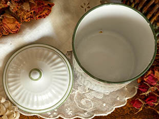 フランスにあるB. B.社がおそらく1930年代に製造したホウロウ製のロゼローズギルロンドブランシュ&ヴェール・トルセーヌパッツポです。B. B.社はフランス人の兄弟がオーストリアでホウロウ製品の製造販売を始めたB. F.社が始まりで、その後チェコスロバキアやフランスで製造するようになり社名をB. B.社と改称したようです。こちらは超レアなTorseine(トルセーヌ)シリーズの中央部分が高く盛り上がったフタの付いたPates(パッツ/パスタ)を入れるためのポ(ポット)で、爽やかなブランシュ(ホワイト)地のエンボスのストライプの柄にヴェール(グリーン)のPatesのオンブレ(シャドウ)書体のロゴと可愛いロゼのローズのギルロンド(ガーランド/花飾り)のパターンがデザインされていてエレガントでオシャレでとてもいい感じです。また、吹き出しのようなロゴの周りの枠も可愛いですね。底面にはB. B.社のマークとTorseine DEK, 3491の表示がありますが、Torseineはおそらく1890年代以前のB. F.社のマークがなかった時代からある表示で当時のホウロウ製品にはTorseine Depose(トルセーヌの登録商標)とReproduction Interdite(模造を禁止)と表示されていたようです。ギルロンドのデザインのポはブルーとブランシュのエンボスストライプ柄のものは多くありますが、ブランシュだけのエンボスストライプの柄のポはフランスでも人気が高くてとても珍しいようです。また、ロゴとトリムがブルーのものよりこちらのヴェールのポの方が珍しくてやはり超レアですね。こちらと同じシリーズにはSucre(シュクレ/シュガー)、Farine(ファリーヌ/小麦粉)、Cafe(カフェ/コーヒー)、Chicoree(チコリー)、Poivre(ポワブル/ペッパー)などのポもありますが、Sel Boite(セルボワット/ソルトボックス)やPot a Lait(ポアレ/ミルクポット)やCafetiere(カフェティエール/コーヒーポット)やCasserole(カスロール/片手鍋)もあるので全部揃えるとフランスの家庭のキュイズィーヌ(キッチン)の雰囲気が漂うようで素敵で楽しいですね。キュイズィーヌの小物入れに便利ですが工夫次第でいろいろとオシャレに使えそうです。1930年代のフランスのホウロウ製品の優しさと素晴らしさを実感させてくれそうな美しいロゼローズギルロンドブランシュ&ヴェール・トルセーヌパッツポです。