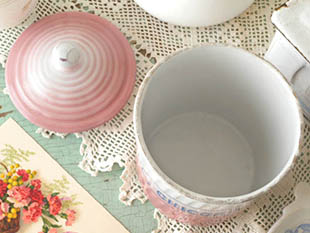オーストリアにあるB. F.社がおそらく1910年代に製造したホウロウ製のロゼ&ブランシュオンブレ・キュイズィーヌチコリーポです。B. F.社はフランス人の兄弟がオーストリアでホウロウ製品の製造販売を始めたのが始まりで、その後チェコスロバキアやフランスで製造するようになり社名をB. B.社と改称したようです。こちらは超レアな中央部分が高く盛り上がった丸い取っ手のあるフタの付いたChicoree(チコリー)を入れるために作られたポ(ポット)で、爽やかなブランシュ(ホワイト)地にロゼ(ピンク)のオンブレ(グラデーション)とオール(ゴールド)のトリムが美しい本体にはブルーフォンセ(ダークブルー)のChicoreeのロゴが立体的なジャドウ書体でデザインされていてエレガントでオシャレでとてもいい感じです。また、ブルーフォンセの吹き出しのようなロゴの周りの枠も可愛いですね。また、フタは同心円で本体は斜めにストライプのエンボス加工がしてあるのも素敵です。底面にはB. F.社のマークとSte Austria B. Fres 8の表示があります。こちらと同じシリーズにはブルーとブランシュのホウロウ製品もありますが、やはりロゼとブランシュのホウロウ製品は超レアでフランスでも大変人気が高いようです。また、こちらと同じシリーズにはSucre(シュクレ/シュガー)、Farine(ファリーヌ/小麦粉)、Cafe(カフェ/コーヒー)、Pates(パッツ/パスタ)、Poivre(ポワブル/ペッパー)などのポもありますが、全部揃えるとフランスの家庭のキュイズィーヌ(キッチン)の雰囲気が漂うようで素敵ですね。キュイズィーヌの小物入れに便利ですが工夫次第でいろいろと楽しくオシャレに使えそうです。1910年代のオーストリアのホウロウ製品の優しさと素晴らしさを実感させてくれそうなシンプルで美しいロゼ&ブランシュオンブレ・キュイズィーヌチコリーポです。