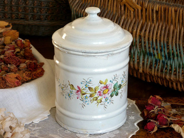 フランスにあるEtoile(エトワール)社が、おそらく1920年代に製造したホウロウ製のローズ&ミオゾティス・ブランシュ&オールカフェポです。こちらは超レアな中央部分が高く盛り上がったフタの付いたブランシュ(ホワイト)にオール(ゴールド)のトリムが美しいキュイズィーヌ(キッチン)用のおそらくCafe(カフェ/コーヒー)を入れるために作られた(ポ)ポットで、本体には可憐な一重のロゼ(ピンク)のローズのお花がデザインされていてエレガントでオシャレでとてもいい感じです。また、ローズのお花の背景には淡くブルーのミオゾティス(忘れな草)のお花が描かれていて遠近感がありとても凝った作りです。また、底面にはオール色でエトワール社のマークとEtoile P.E.N.のロゴの表示があります。こちらのシリーズにはAllumettes Boite(アリュメットボワット/マッチボックス)やCafetiere(カフェティエール/コーヒーポット)やPichet(ピシェ/ピッチャー)などもあるようですが、どれもやはり超レアなアイテムのようです。エトワール社のホウロウ製品はきれいなお花のイラストがデザインされているものが多く、どれもデザインクオリティーが高いのでフランスでも大変人気があり入手がとても難しくなってきています。エレガントなローズとミオゾティスのカフェポはうっとりと見つめてしまいそうな美しくて価値ある超レアな一品です。