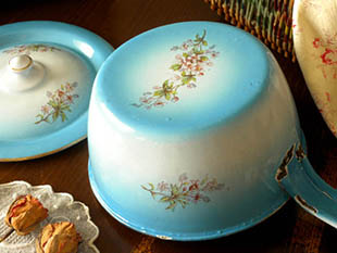 1806年にフレデリック・ジャピーの息子達が創設したジャピーフレール社が、おそらく1930年代に製造したホウロウ製のロゼスリーズィエ・ブルー&ブランシュオンブレカスロールです。ジャピーフレール社はフランスでオルロージュ(時計)の製造で有名な父親のフレデリック・ジャピーから事業を受け継いだ三人の息子達の会社でカフェムーラン(コーヒーミル)、マシーヌ・エクリール(タイプライター、ホウロウ製品、事務機器の製造で有名ですがフレールは兄弟という意味です。こちらは超レアなフタのある長い持ち手の付いたCasserole(カスロール/片手鍋)で、フタと本体には爽やかなブランシュ(ホワイト)地にブルーのオンブレ(グラデーション)に可愛いロゼのスリーズィエ(桜)のお花がデザインされていてエレガントでオシャレでとてもいい感じです。また、オール(ゴールド)の縁取りやリーニュ(ライン)も素敵ですが、とてもデザインクオリティーが高いですね。こちらと同じシリーズにはサイズの異なるものや沢山の穴のある水切り用のPassoire(パソワール/コランダー)などもあるので全部揃えるとフランスの家庭のキュイズィーヌ(キッチン)にいるようでオシャレで素敵ですね。ジャピーフレール社のホウロウ製品は美しいお花がデザインされたものが多いですが、見ているだけで1930年代のフランスのホウロウ製品の優しさと素晴らしさを実感させてくれそうな大変美しい超レアな一品です。