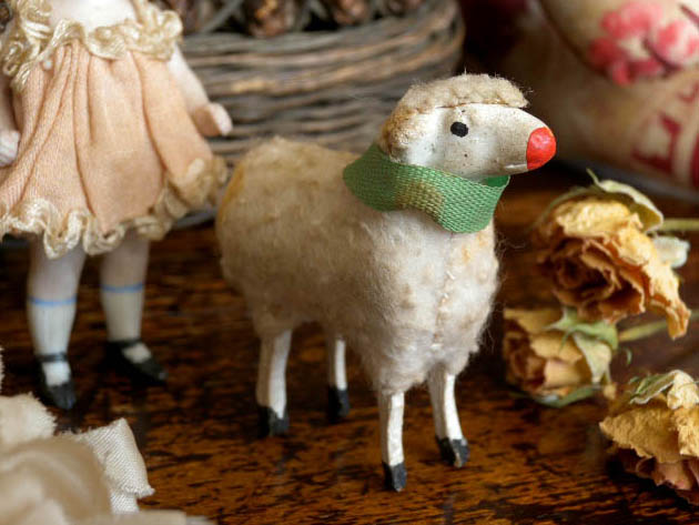 ドイツのドレスデンから南西へ50kmほど行ったチェコとの国境に近いErzgebirge(エルツゲビルゲ/エルツ山地)のSeiffen(ザイフェン)の町で、おそらく1890年から1900年代頃に製作された木とコンポジション(おがくずや粘土などをニカワなどで混ぜ合わせて型抜きしたもの)と羊毛で作られたエルツゲビルゲ・ラムフィグーアです。エルツゲビルゲのザイフェンの町では14世紀頃から豊富にある木材から木工品の製作が始まったようで「くるみ割り人形」などが有名なようです。こちらは超レアなおそらく一番小さなサイズのコンポジションの頭と胴体に木製の脚が付いたLamm(ラム/子羊)のフィグーア(フィギュア)で、体には本物の羊毛が貼り付けられています。また、グリュン(グリーン)のシュライフェ(リボン)を首に巻いて赤茶色のお鼻につぶらな黒い瞳でじっとムッティ(ママ)を見ている姿が可愛くてとてもいい感じです。また、お尻の小ちゃなシッポも可愛いですね。おそらく最初はヴァイナハテン(クリスマス)の飾り物に作られたようですが、木製の羊小屋などもあるようなのでいっしょにジオラマで飾ると世界観があって楽しいですね。また、コフレ(箱)などにビスキュイプーペ(ビスクドール)やクロモなどといっしょにいれて飾ってもオシャレですね。とても小さいけれども本物のように作られた大変可愛いエルツゲビルゲ・ラムフィグーアです。