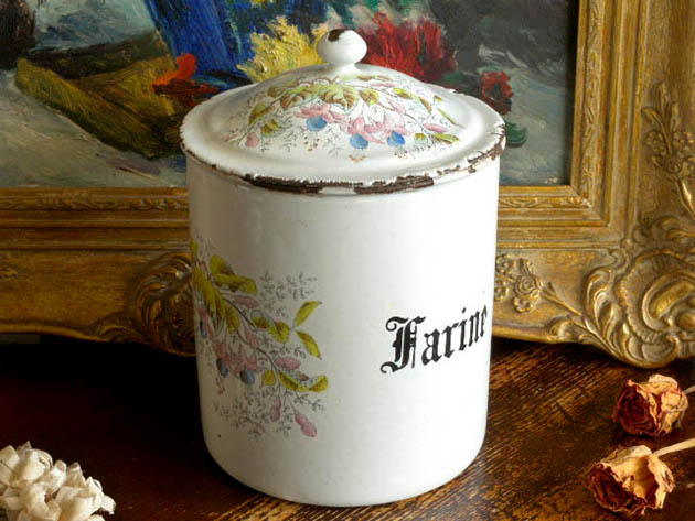 オーストリアにあるB. F.社が、おそらく1900年代に製造したホウロウ製のトネル・ドゥ・グロワール・アルルカンファリーヌポです。B. F.社はフランス人の兄弟がオーストリアでホウロウ製品の製造販売を始めたのが始まりで、その後チェコスロバキアやフランスで製造するようになり社名をB. B.社と改称したようです。こちらは激レアな中央部分が高く盛り上がったフタの付いたFarine(ファリーヌ/小麦粉)を入れるためのポ(ポット)で、爽やかなブランシュ(ホワイト)地の本体の正面にはノワール(ブラック)の格調高いブラックレター書体のFarineのロゴがデザインされています。また、フタと本体の左右にはルージュ(レッド)のガクの中央にブルーフォンセ(ダークブルー)の丸い実を付けたTonnelle de Gloire Arlequin(トネル・ドゥ・グロワール・アルルカン/クサギ)の低木のイラストがデザインされていてエレガントでオシャレでとてもいい感じです。また、ジャバンでは葉に独特の匂いがあるので臭木(くさぎ)と呼ばれていますが、フランス語のトネル・ドゥ・グロワール・アルルカンの意味は「恵みの木陰の道化師」のようで、ブルーフォンセの実の部分が道化師の頭でルージュの尖ったガクが道化師の衣装の襟のように見えるのでこんなにオシャレな名前が付いているようです。また、英語ではHarlequin Glory Bower(ハーレクイン・グローリー・バウアー)というようですがこちらもオシャレですね。また、欧米ではトネル・ドゥ・グロワール・アルルカンの木は主に観賞用として庭に植えられているようですが、秋に実が熟すと小鳥達がやって来て全て食べ尽くしてしまうようです。また、底面にはルージュ(レッド)でB. F.社のマークとMarque Deposee(登録商標) B. Fresの表示がありますが、マークを挟むようにMarque Deposeeの表示があるものは滅多にお目にかかれなくてやはり大変珍しくて激レアですね。また、手書きの376/2の表示があるのも珍しいですね。また、マークの王冠のイラストも大きくてとても立派な雰囲気にデザインされているのも素敵です。こちらと同じシリーズには大きなサイズからCafe(カフェ/コーヒー)、Riz(リ/ライス)、Sel(セル/ソルト)、Poivre(ポワブル/ペッパー)、The(テ/紅茶)などのポもありますが、RizとSelのポは中々入手が難しいアイテムのようです。また、全部揃えるとフランスの家庭のキュイズィーヌ(キッチン)の雰囲気が漂うようで素敵で楽しいですね。キュイズィーヌの小物入れに便利ですが工夫次第でいろいろとオシャレに使えそうです。1900年代のフランスのホウロウ製品の優しさと素晴らしさを実感させてくれそうな美しい激レアな一品です。