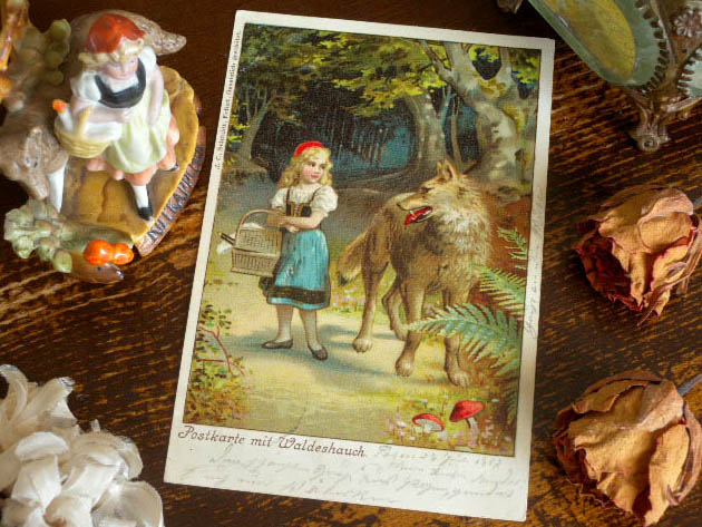 ベルリンから南西に230kmほど行ったErfurt(エアフルト)の町で1823年にJohann Christoph Schmidt(ヨハン・クリストフ・シュミット) が創設したヨハン・クリストフ・シュミット出版社が、おそらく1900年代の初め頃に製造した厚紙製のロートカピヒェン&ヴォルフ・ポストカルテです。ヨハン・クリストフ・シュミット出版社は、園芸会社として創業しているようですが、古都エアフルトは美しい花の町として世界的に有名なようです。こちらは超レアなRotkappchen(ロートカピヒェン/赤ずきんちゃん)のお話の楽しいイラストがデザインされたPostkarte(ポストカルテ/ポストカード)で、表面には森の家に住んでいる病気のおばあさんにコルプ(バスケット)に入ったクーヘン(焼き菓子)と葡萄酒を届ける途中の道で親切そうな悪いヴォルフ(オオカミ)に出会ったロートカピヒェンのイラストがデザインされていてオシャレで可愛くてとてもいい感じです。また、Postkarte mit Waldeshauch(森の息吹のポストカード)とJ. C. schmidt, Erfurt.(J. C.シュミット、エアフルト) Gesetzlich geschiitzt.(版権があります)の表示があります。また、イラストは全て特色インクを使った高価な石版印刷で刷られているのでイラストの発色が良くとてもきれいです。また、裏面にはドイツ語のPostkarteの他にも沢山のヨーロッパの言葉でポストカードと書かれています。また、Posen 29.7.02.の消印があるので1902年7月29日にエアフルトの町に近いPosen(ポセン)の町から投函されたポストカルテのようです。ロートカピヒェンのお話はフランス人のシャルル・ペローが1697年に出版した「ペロー童話集」の中にありますが、1812年頃にドイツ人のグリム兄弟がキンダー達のために可愛くリメイクして有名になったようです。200年近くも前に創設された歴史のあるヨハン・クリストフ・シュミット出版社のロートカピヒェンのイラストが大変可愛いロートカピヒェン&ヴォルフ・ポストカルテです。