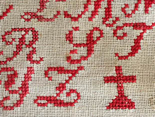 フランスで1908年に木綿の生地で制作されたルージュブロデル・アベセデールです。Abecedaire(アベセデール)はアルファべ(アルファベット)や数字などをブロデル(刺繍)したサンプラー(刺繍見本)のことで、17世紀頃からヨーロッパの女性の教養やたしなみのために制作されたようです。また、モチーフとしては主にアルファべや数字や人物や動植物などが使われたようです。こちらは大変レアなイヴォワール(アイボリー)のブロック織りの四角いフォルムの生地で制作されたアベセデールで、本体にはABCのアルファべや十字架や1から0までの数字やMC のイニツィアーレ(イニシャル)やお花や枝に止っている小鳥や1908の数字や小さなテーブルなどが、ルージュ(レッド)の糸でブロデルされていてオシャレで可愛くてとてもいい感じです。また、本体の周りは菱形のような連続模様がブロデルされていているのも素敵ですね。アベセデールは1950年代までブロデルの技術見本として制作されていましたが、今ではコレクターアイテムとして大変人気があるようです。ナプロンとして使ったり、額に入れてお部屋に飾ったりして工夫次第で色々と楽しくオシャレに使えそうな今から114年前に制作された大変貴重な一品です。(実物のルージュの糸の色は写真よりもう少し濃い赤です)